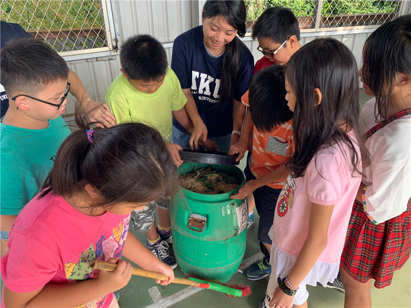 向小朋友們講解堆肥製作方法,並讓他們參與破碎、混合等過程。總共做兩桶,讓小朋友們都能體驗其過程,也邊解說,主要分破碎、放入堆肥桶和翻桶子混合三部分說明。此次實驗比例是空心菜、米糠、腐熟堆肥做6:4:2之比例,材料為淡水環保志工提供,也混入部分興仁國小當日生廚餘。