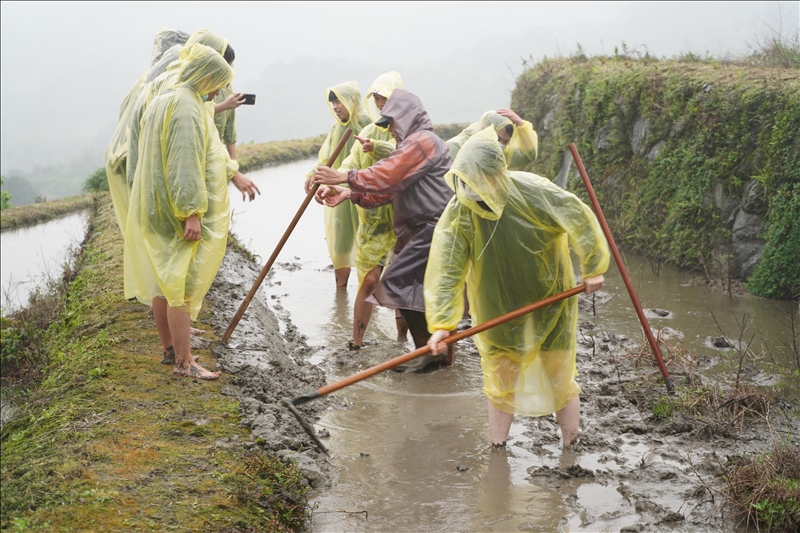 學生事務處的武學務長也特地開車前來,陪同學生們一起打著赤腳、捲起褲管、拿上耙子,進行田埂的修復。學生們從一開始些許的抗拒,到彎下腰修復田埂,甚至會觀察田地裡的蝌蚪及蝸牛、欣賞嵩山社區迷人的風景。有部分學生表示這是他第一次赤腳踏入泥土當中,也有學生說到這是他第一次親手抓蝌蚪、還有學生表達梯田景色的舒壓及療育。