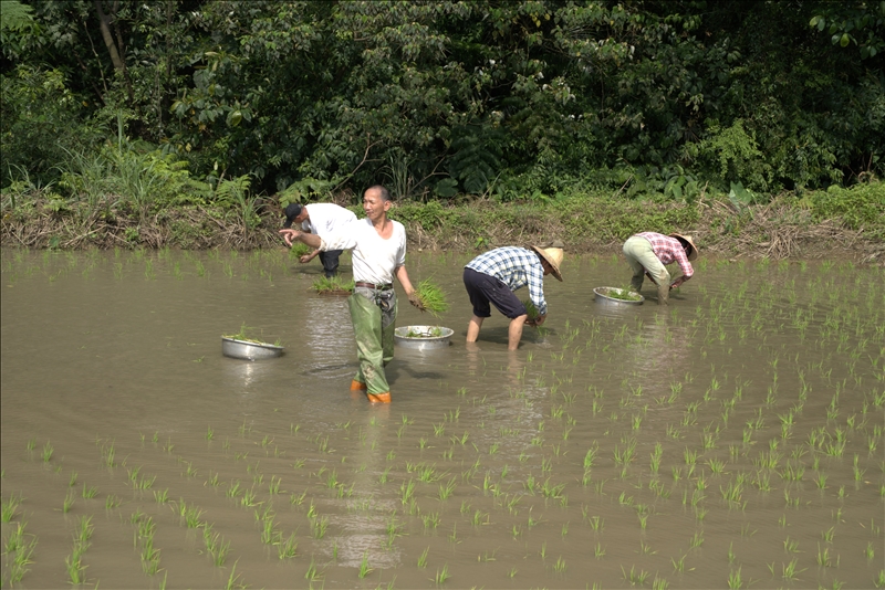 下梯田插秧前,王理事長分配給每位學員一人一個分苗器,並說明到分苗器的作用,因為秧插時需要平均的分配秧苗數量,每株秧苗之間也要保由足夠的空間使其成長,所以分苗器的功用就需要將老農栽育的秧苗片細分成小株的秧苗,以利後續插秧。每位學員跟隨著一名老農,從零開始學習。老農也和我們分享多年以來插秧的經驗,雙腳與肩同寬,插三到五株秧苗,每株秧苗間格距離約25公分左右,一排插完之後,再倒退走繼續插秧苗,因會長時間呈現半蹲姿勢而造成腰間痠痛。